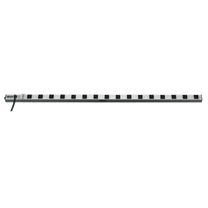 The SS7415-15 4-ft. power strip with AC surge suppression offers a convenient method of horizontal or vertical power distribution in equipment racks, computer rooms, workbenches, raceways and more. Includes 16 NEMA 5-15R output receptacles with 2.717-in. center-to-center spacing, 15-ft. AC line cord and adjustable mounting clips for installation in a wide variety of applications. Protects connected equipment from transient surges and line noise with built-in surge suppression rated at 1650 joules. Corded, multi-outlet strip reduces cabling clutter and enables the connection of multiple electrical devices to a single AC wall socket. Features rugged all-metal housing, lighted power switch with transparent guard to prevent accidental shutoff, 15A resettable circuit breaker and attractive gray housing with black output receptacles.