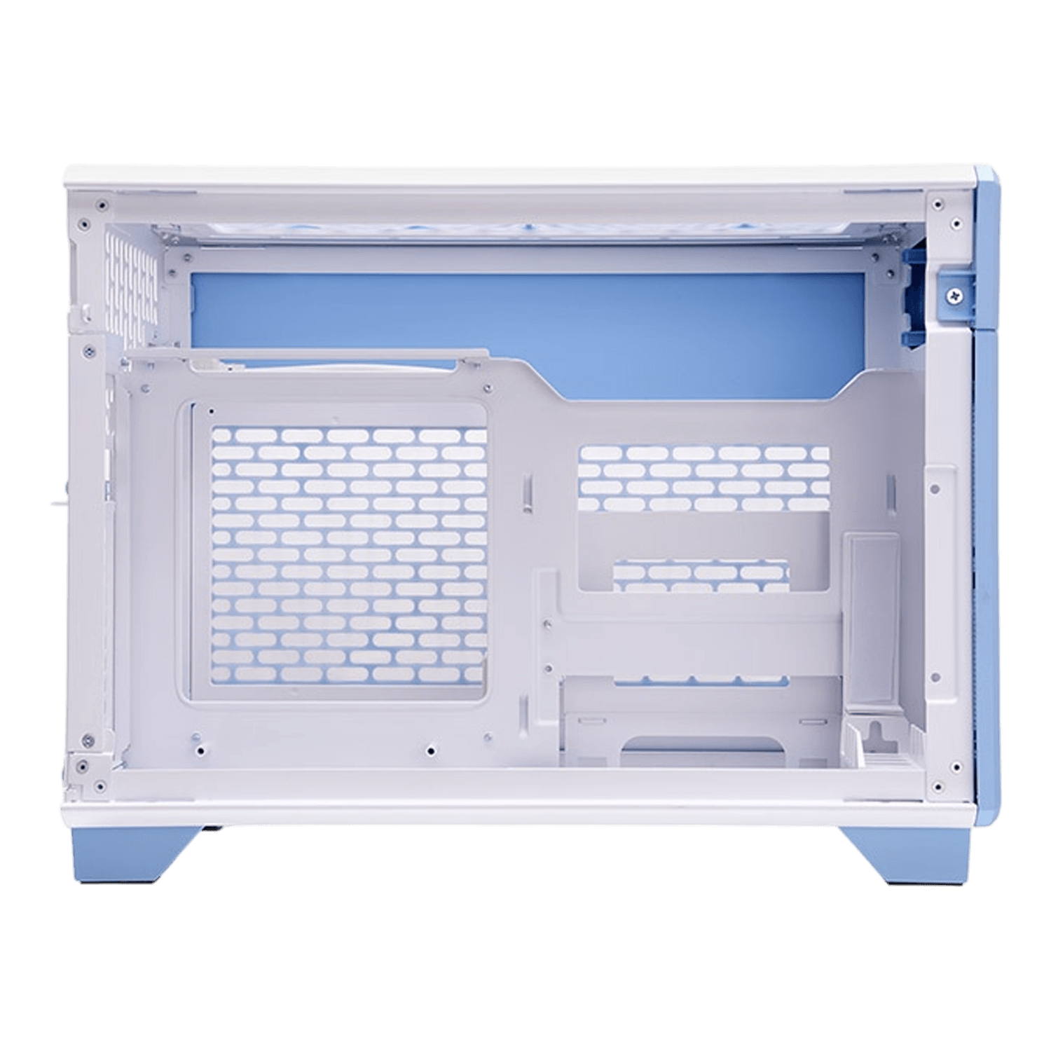 The TR100 Hydrangea Blue Mini Tower Chassis is a compact, dual-chamber, Mini-ITX case that is designed for those who demand performance and portability. The dual-chamber design positions the mini-ITX motherboard and SFX PSU in the right chamber, with the graphics card in the left, connected via a PCIe 4.0 riser cable. It supports two 120mm/140mm top fans and up to a 280mm AIO for cooling, plus two 2.5” SSDs, one in each chamber. All panels are removable and well-ventilated for optimal cooling and an easier build. To make it more visual appealing, a separately sold 3.9" LCD Screen Kit is also an option. Additionally, the separately sold suitcase allows users to carry the PC case and a complete gaming setup with them!